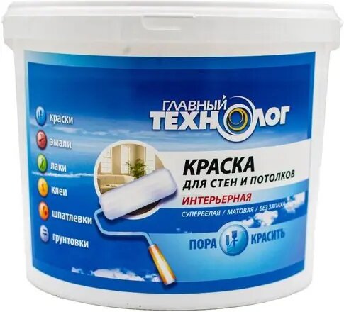 Краска для стен и потолков моющаяся Главный Технолог, матовая, супербелая, 7 кг