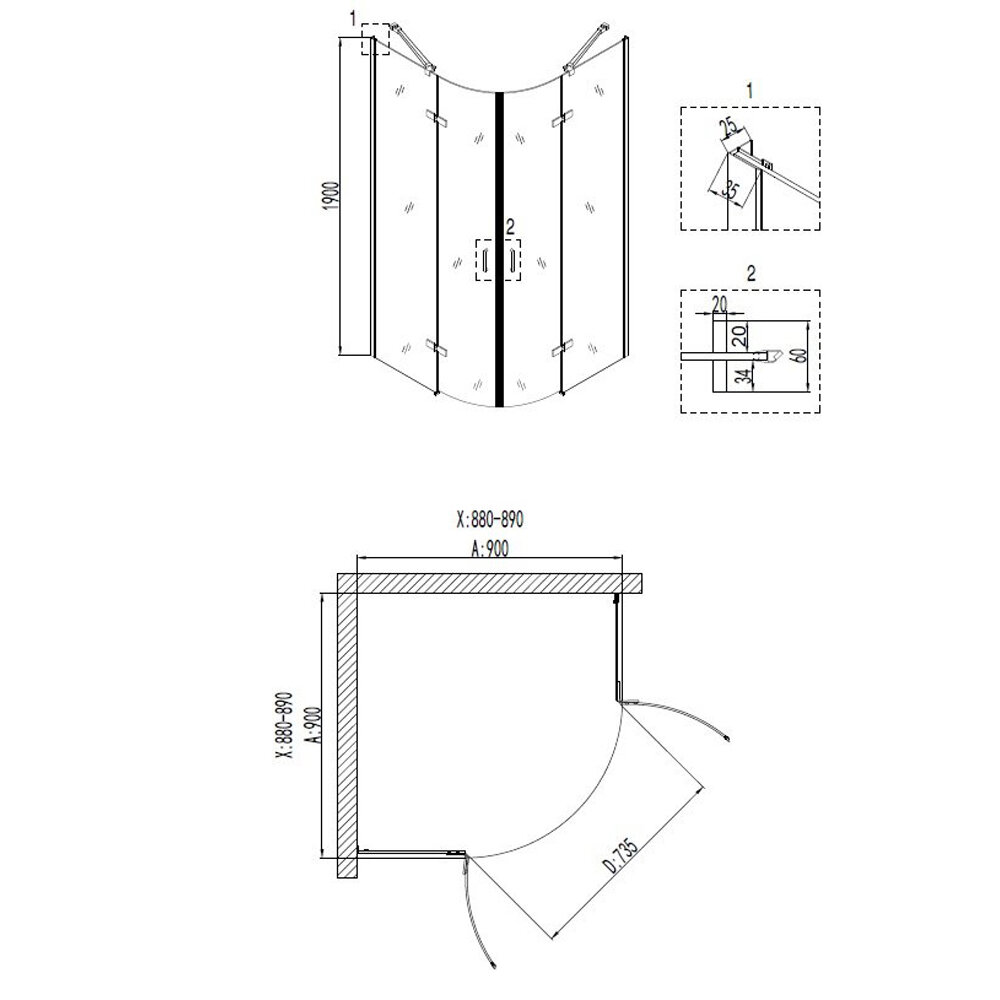 Душ. ограждение NG-6815-08 BLACK (90*90*190) полукруг, двери распашные, 1 место