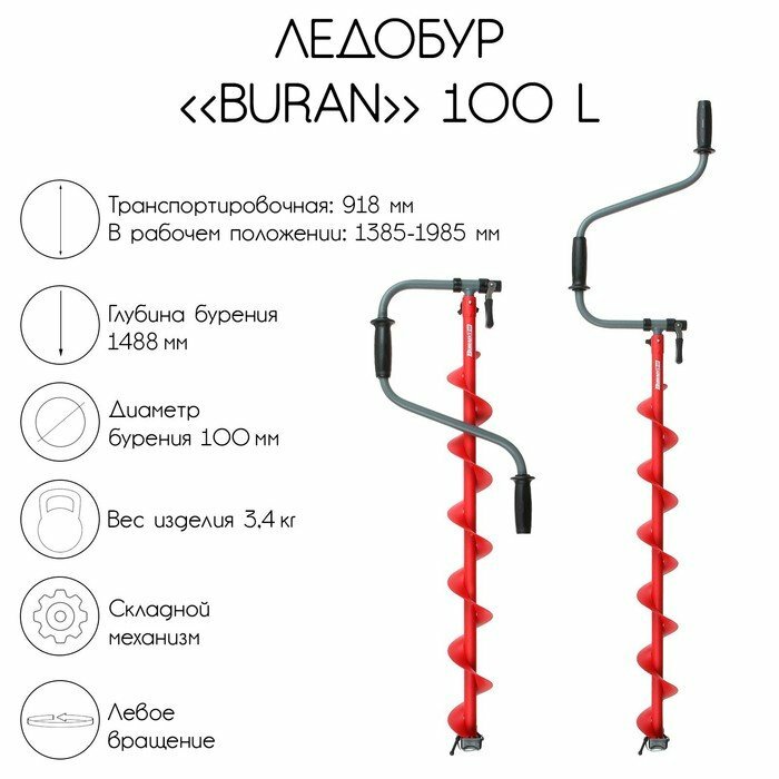Ледобур BURAN 100L, левое вращение, цельнотянутый шнек, цвет красный