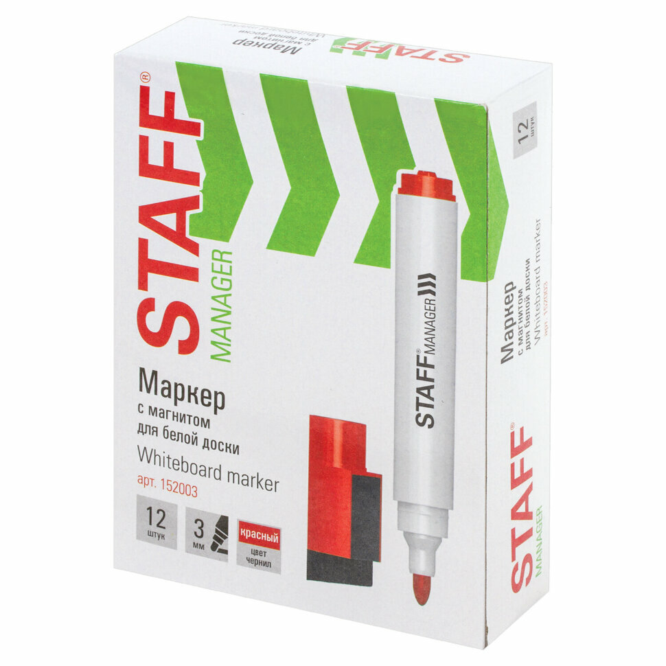 Маркер стираемый для белой доски на магните со стирателем, красный, STAFF "Manager" WBM-002, 3 мм, 152003 - 12 шт.