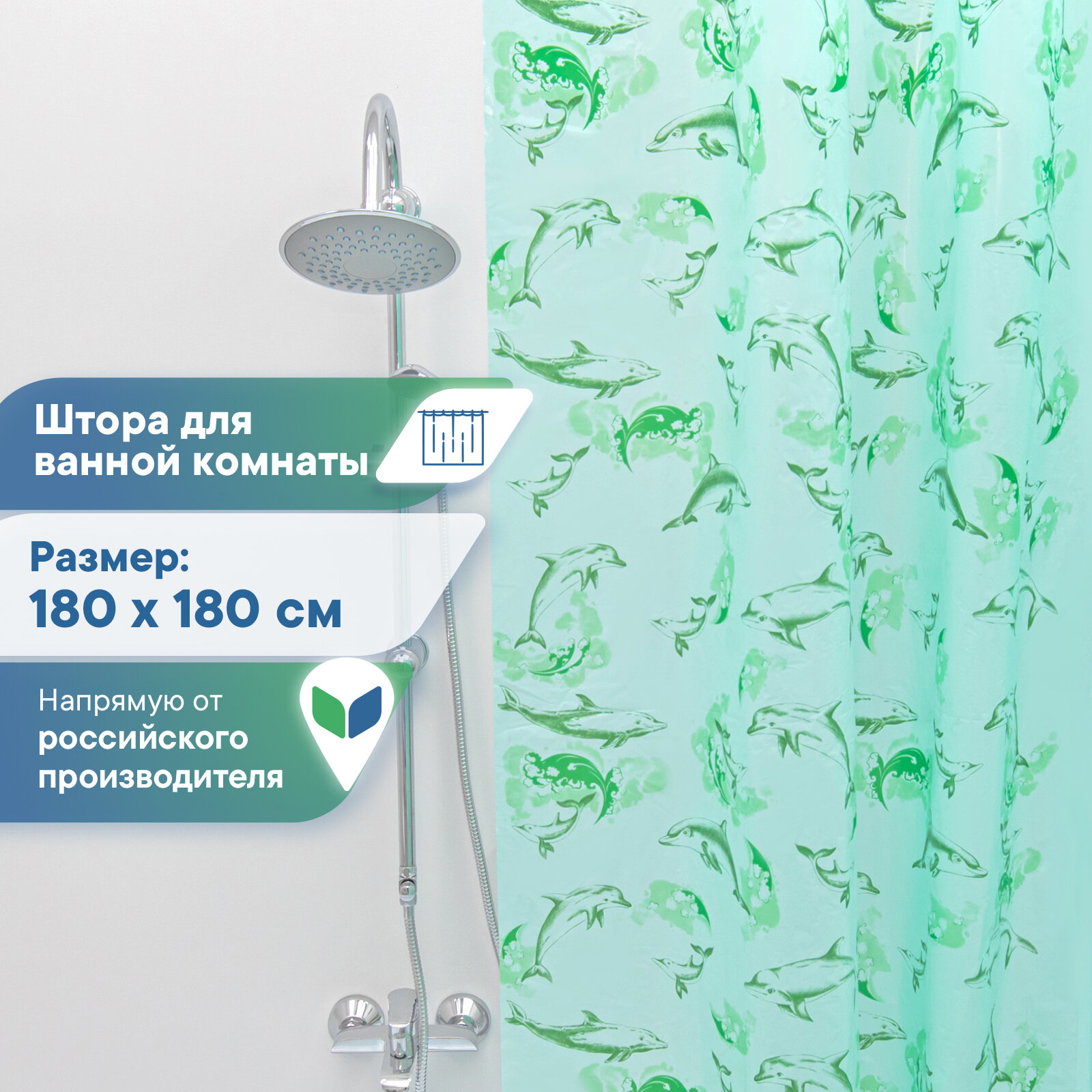 Купить Штора для ванной комнаты VILINA водонепроницаемая с рисунком занавес с кольцами 180х180 см Дельфины зелёная