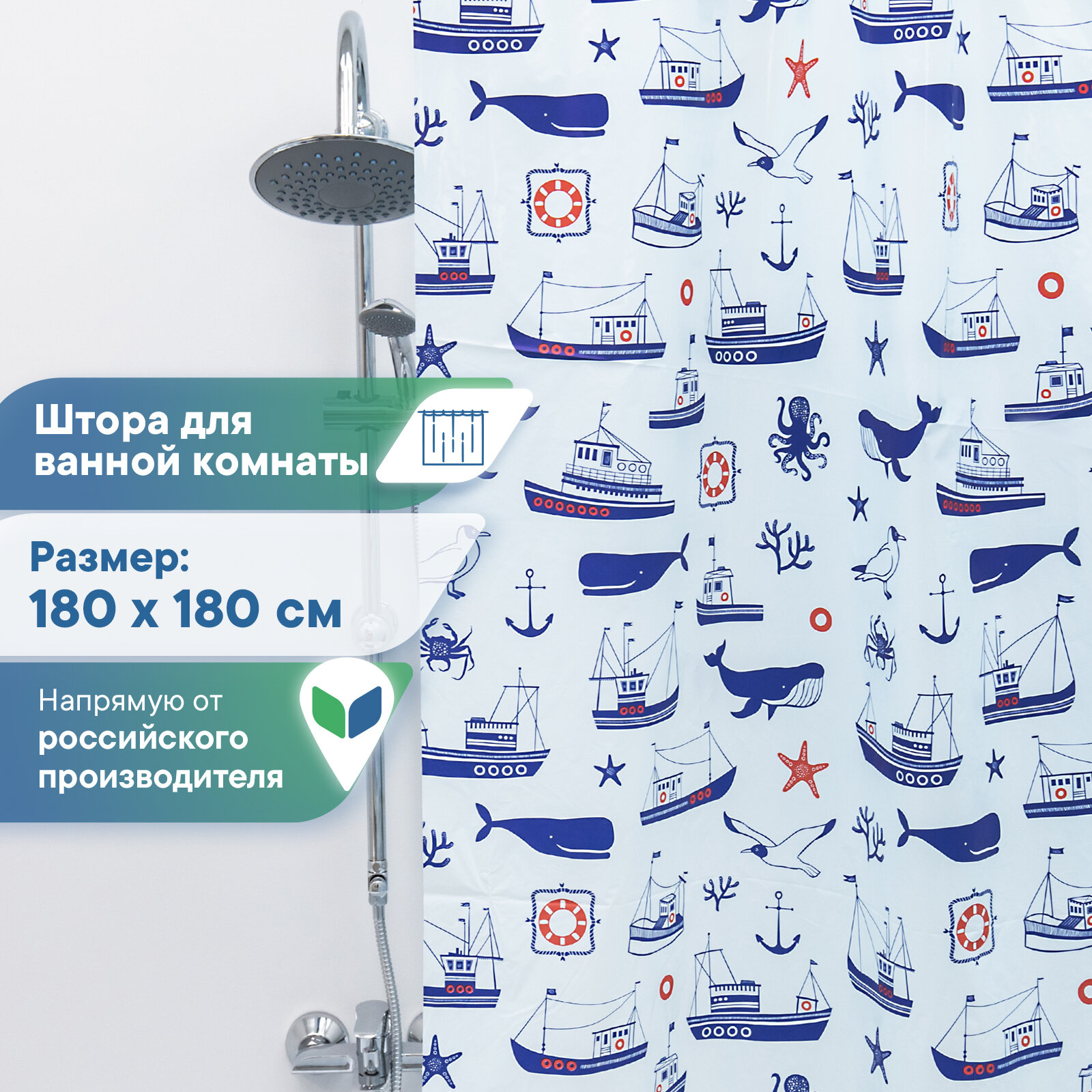 Купить Штора для ванной комнаты VILINA водонепроницаемая с рисунком занавес с кольцами 180х180 см Гавань голубая