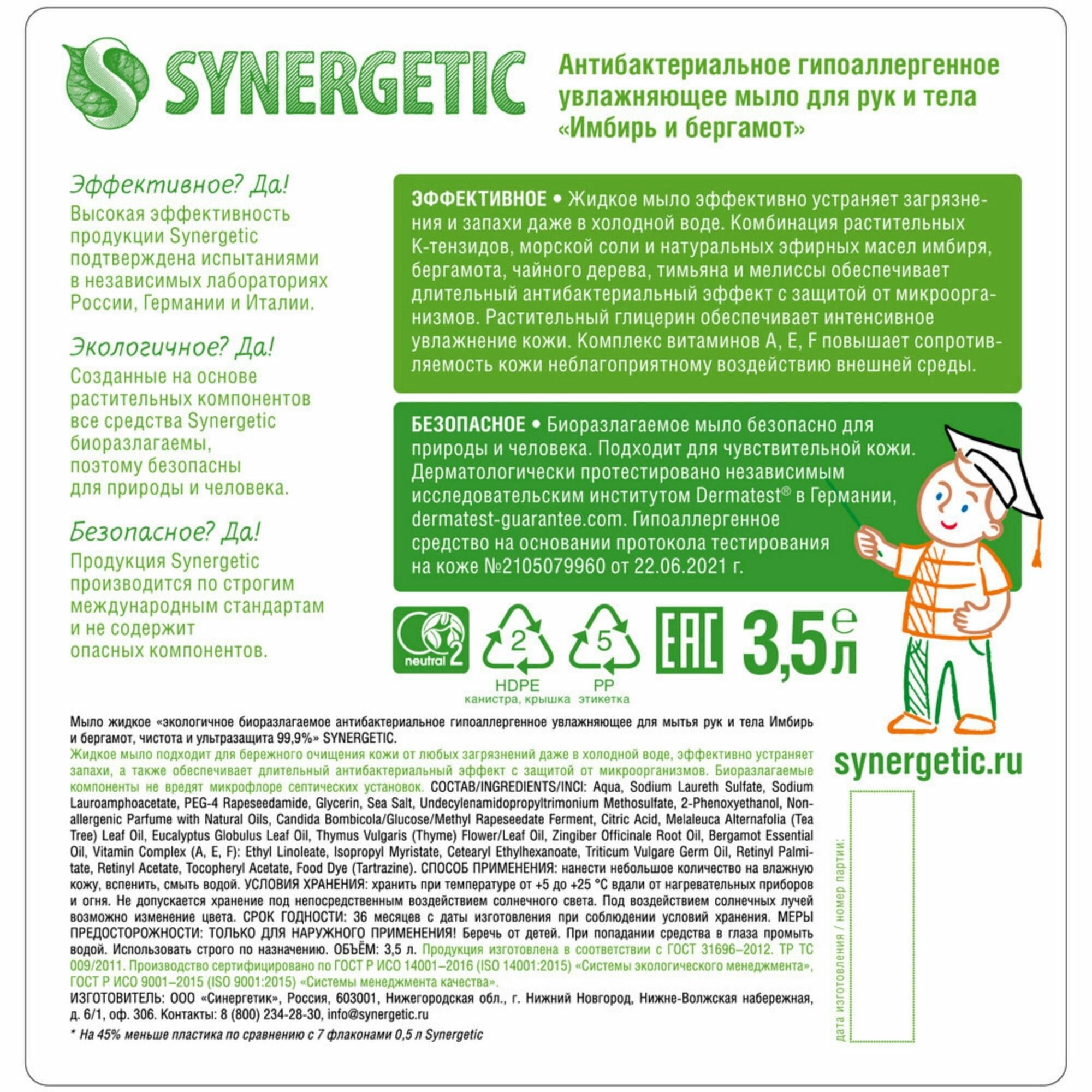 Мыло жидкое экологичное Synergetic, антибактериальное, гипоаллергенное, имбирь и бергамот, 3.5 л