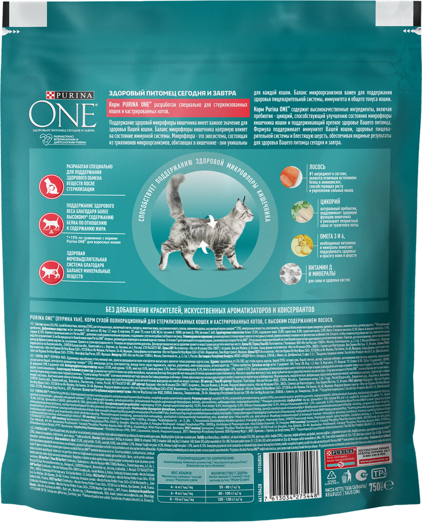 Сухой корм PURINA ONE (750 гр.) для стерилизованных кошек и кастрированных котов, с высоким содержанием лосося и пшеницей