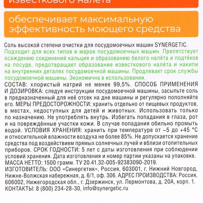 Купить Synergetic Соль для посудомоечной машины "Synergetic", 1.5 кг
