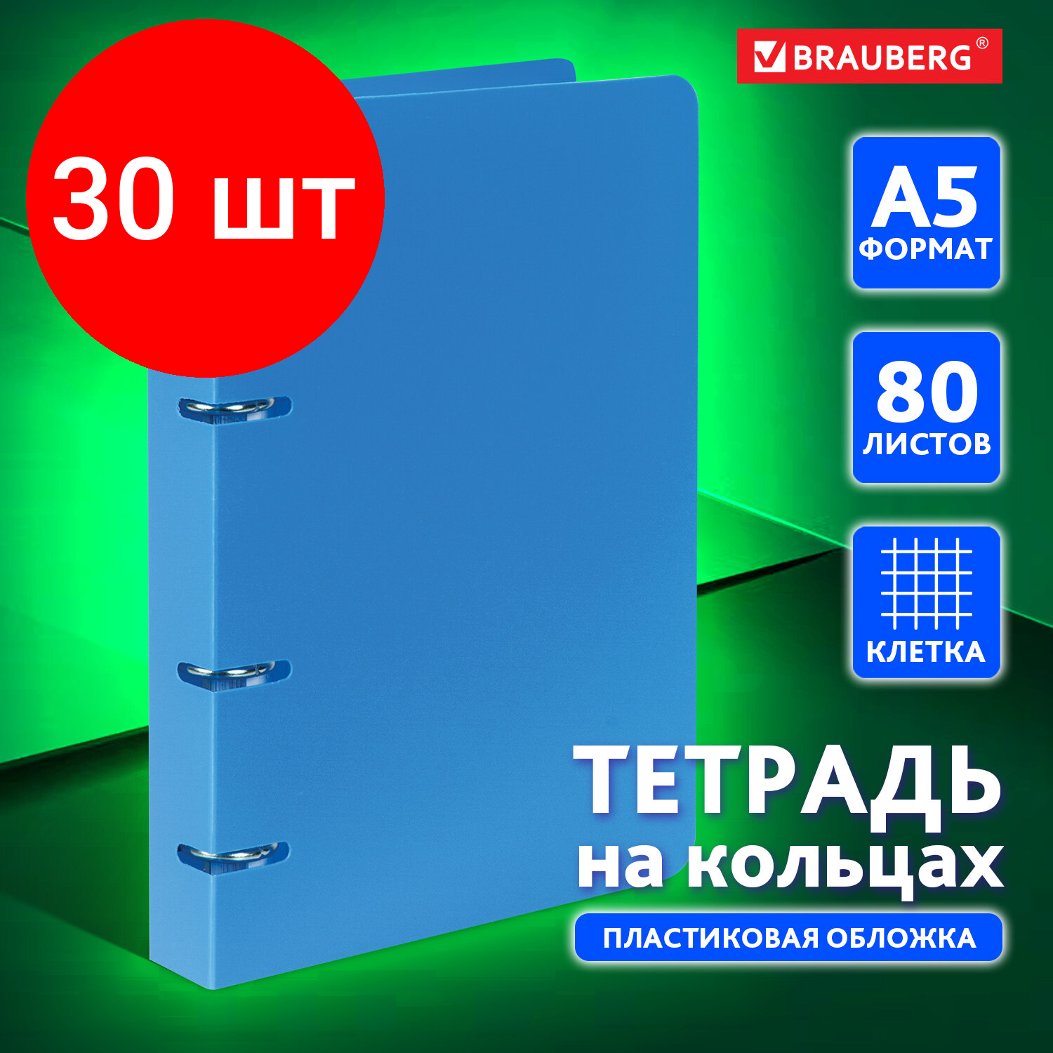 Комплект 30 шт, Тетрадь на кольцах А5 (160х215 мм), 80 л., пластиковая обложка, клетка, BRAUBERG, "Голубой", 403251