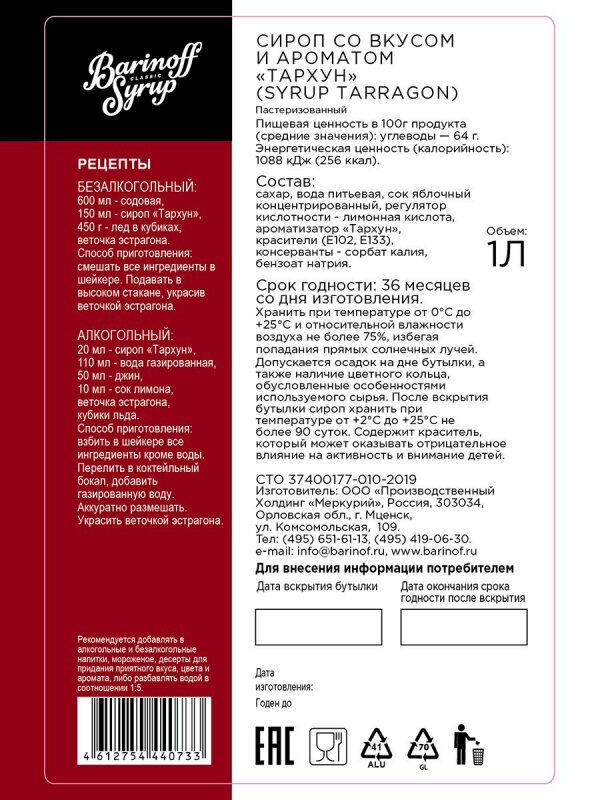 Купить Barinoff Сироп БАРinoff «Тархун», 1 л