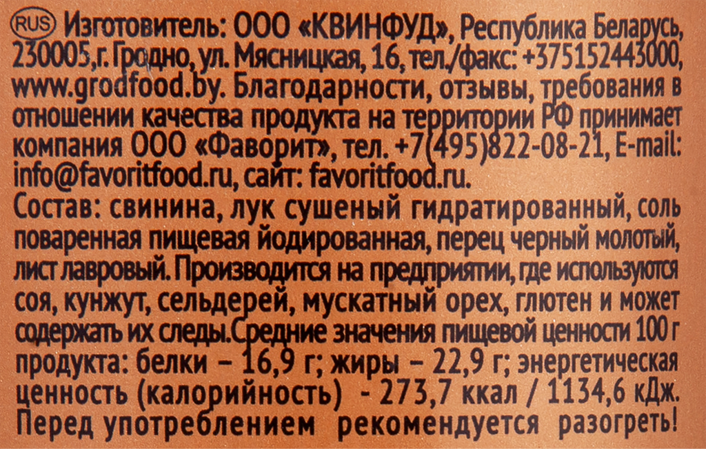 | Состав | свинина, лук репчатый сушеный, соль поваренная пищевая йодированная, перец черный молотый, лист лавровый |