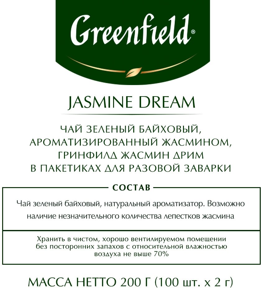 Чай GREENFIELD "Jasmine Dream" зеленый с жасмином, 100 пакетиков в конвертах по 2 г, 0586-09 В комплекте: 1шт.