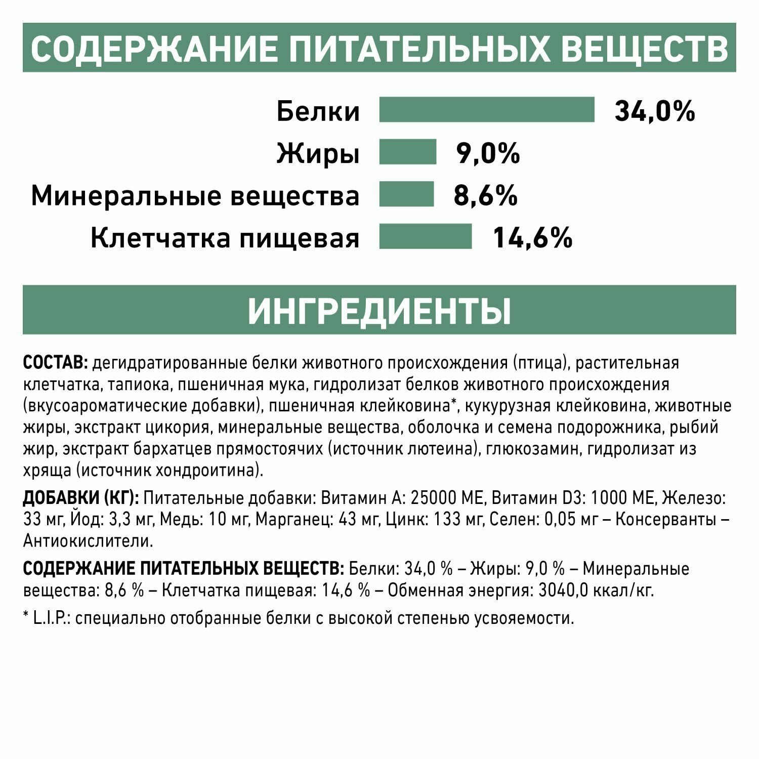 | Состав | дегидратированное мясо птицы, растительная клетчатка, тапиока, пшеничная клейковина, кукурузная клейковина, пшеничная мука, гидролизат животных белков, животные жиры, минеральные вещества, жом цикория, рыбий жир, оболочки и семена подорожника, гидролизат из панциря ракообразных (богат глюкозамином), экстракт бархатцев прямостоячих (источник лютеина), гидролизат из хряща (источник хондроитина) |