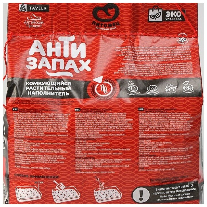 | Дополнительная информация | не пылит и не выносится из лотка; экономичен и удобен в использовании; клетчатка, входящая в состав растительных волокон, обеспечивает отличное комкование; крепкий комок использованного наполнителя легко убрать из лотка; при этом наполнитель Антизапах можно смывать в унитаз; гранулы растворяются в воде в считанные секунды |