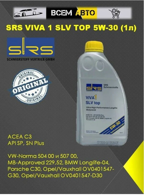 Масло моторное SRS VIVA 1 SLV top 5W30, 504/507, 1 литр 22779