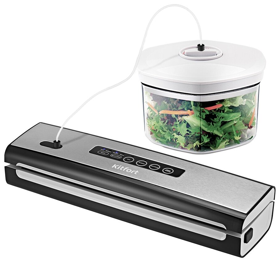 | Отзыв: | Долго выбирала. Остановила свой выбор на Kitfort КТ-1510. В комплект входит сам вакууматор, шланг для контейнеров, резак для пленки и 5 пакетов.