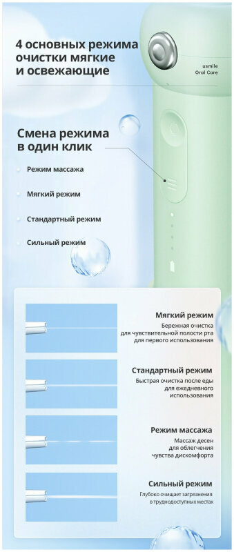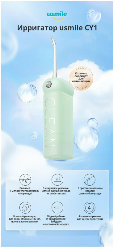 Ирригатор usmile CY1 Светло-зелёный цвета, 4 режима, время автономной работы 90 дней, резервуар для воды объемом 180 мл