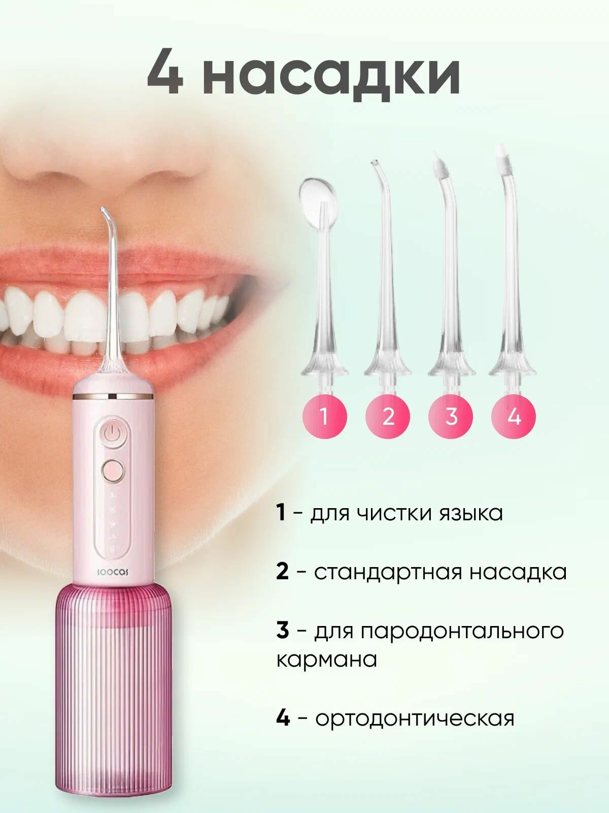 Портативный ирригатор Soocas/ирригатор с 4 насадками в комплекте/7 режимов/струйный ирригатор/голубой