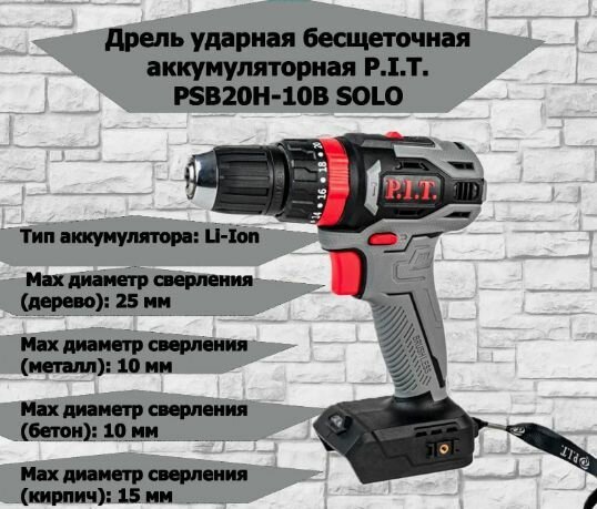 Аккумуляторная дрель-шуруповерт ударная P.I.T. PSB20H-10B SOLO