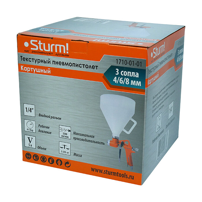 Краскопульт пневматический картушный для штукатурки, бак 5 л, сопла 4, 6, 8 мм Sturm! интересное: