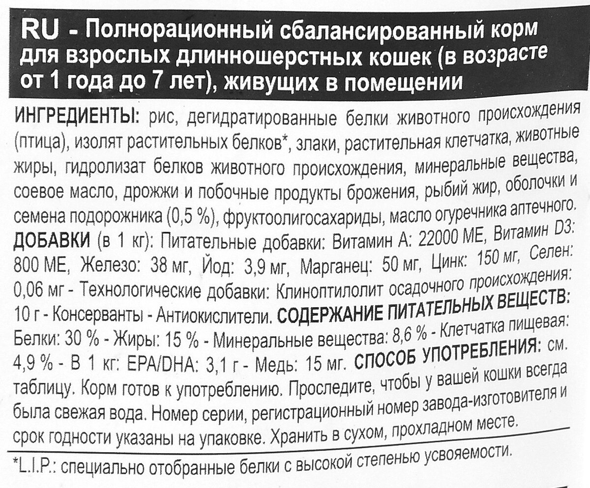 | Состав | рис, дегидратированные белки животного происхождения (птица), изолят растительных белков, пшеница, животные жиры, растительная клетчатка, гидролизат белков животного происхождения (вкусоароматические добавки), мука из зерновых культур, минеральные вещества, соевое масло, дрожжи и побочные продукты брожения, рыбий жир, оболочки и семена подорожника (0,5 %), фруктоолигосахариды, масло огуречника аптечного |