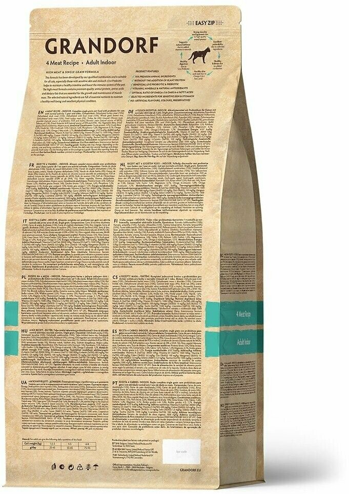 Корм для кошек GRANDORF 4 Мяса Indoor 2кг. Для взрослых кошек от 1 года с нормальной активностью. С пробиотиками