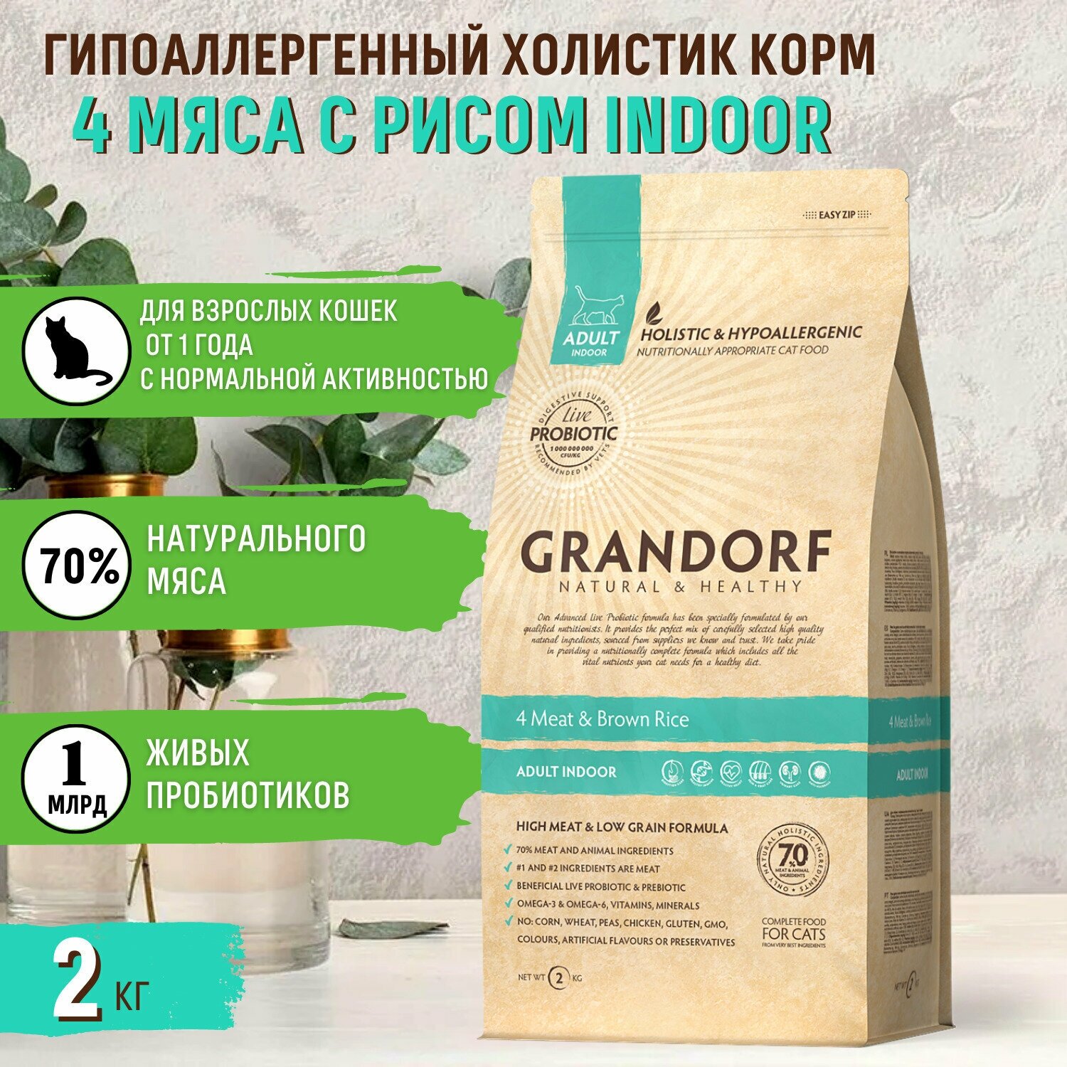 GRANDORF CAT LIVING PROBIOTICS 4 MEAT & RICE INDOOR низкозерновой с живыми пробиотиками для взрослых кошек живущих дома с мясом и рисом (2 + 2 кг)