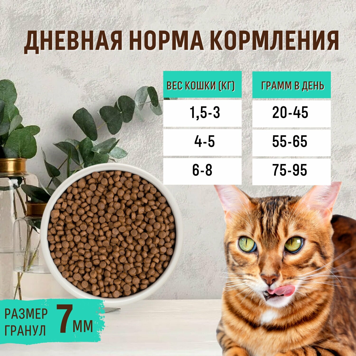 | Дозировка | для кошки среднего веса 4-5 кг: 55-65 г в день |