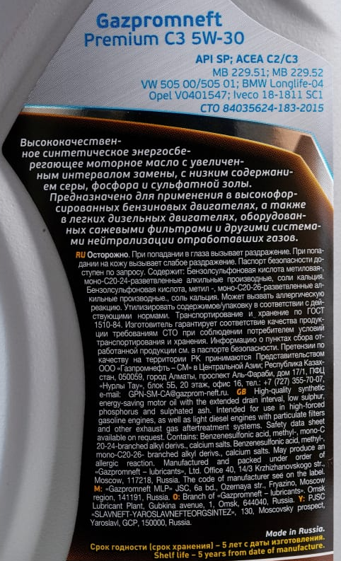 | Допуски OEM | BMW Longlife-04 / MB 229.51 / MB 229.52 / Opel OV0401547 / VW 505.00 / VW 505.01 |