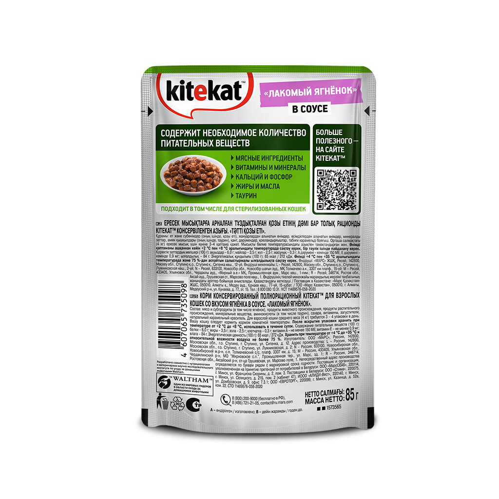 Китекат 10200470/10220176/10226960/10227791/10251340 пауч для кошек Ягненок в соусе 85г