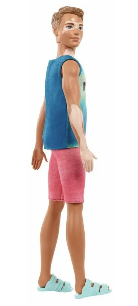 Кукла Barbie Игра с модой Кен DWK44 шатен с витилиго в голубой майке и розовых шортах