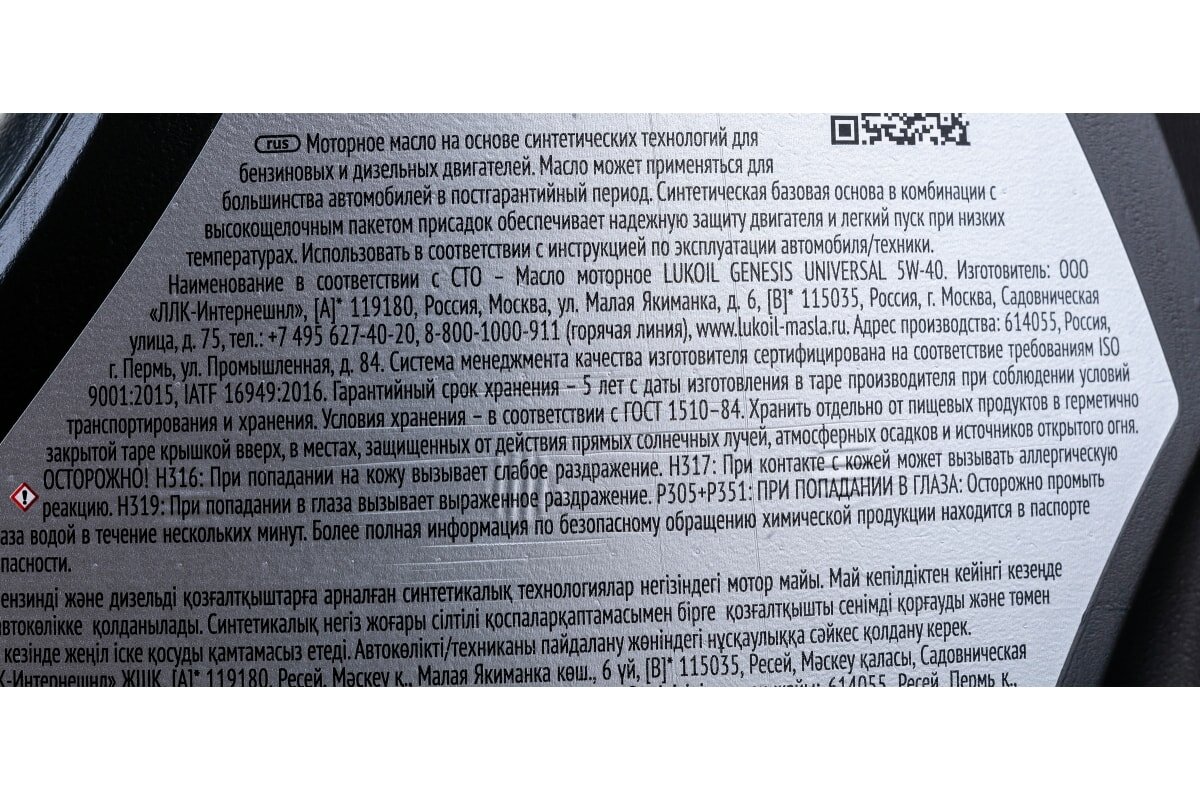 масло моторное lukoil genesis universal api sn acea a3/b3 a3/b4 4л п/с 5w40 4л полусинтетическое