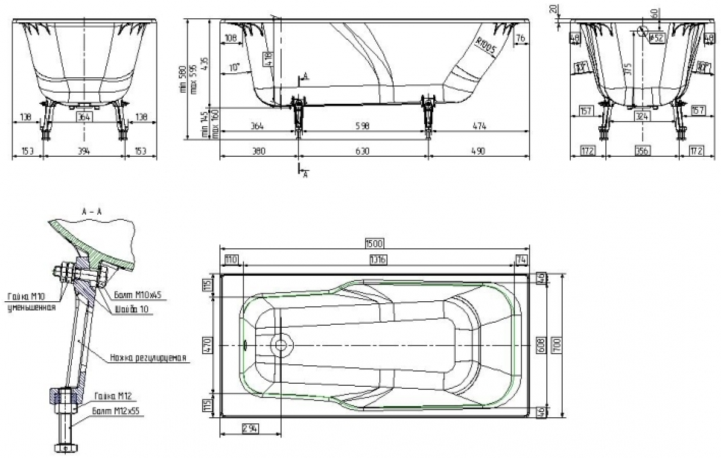| Минусы: | Кривая, фиксация ножек ввиду особенностей конструкции крепежного ушка плохая, при перемещении ванны с ножками они выпадают. Для крепежа предусмотрено не отверстие а прорезь в которую проходит болт с шайбой на обратной стороне |