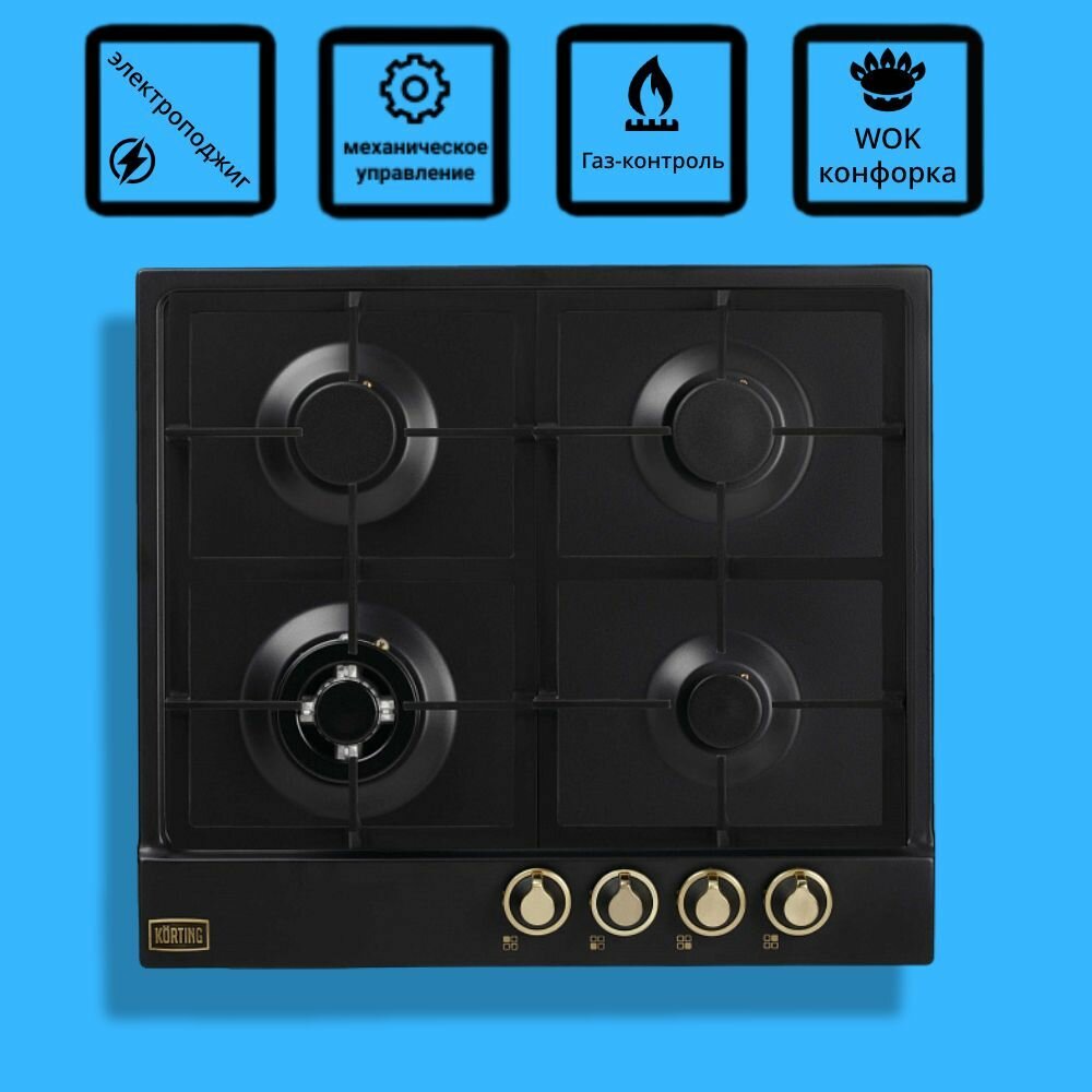 Варочная панель Korting Газ, 60 см, ретро, WOK-конфорка, матовый черный
