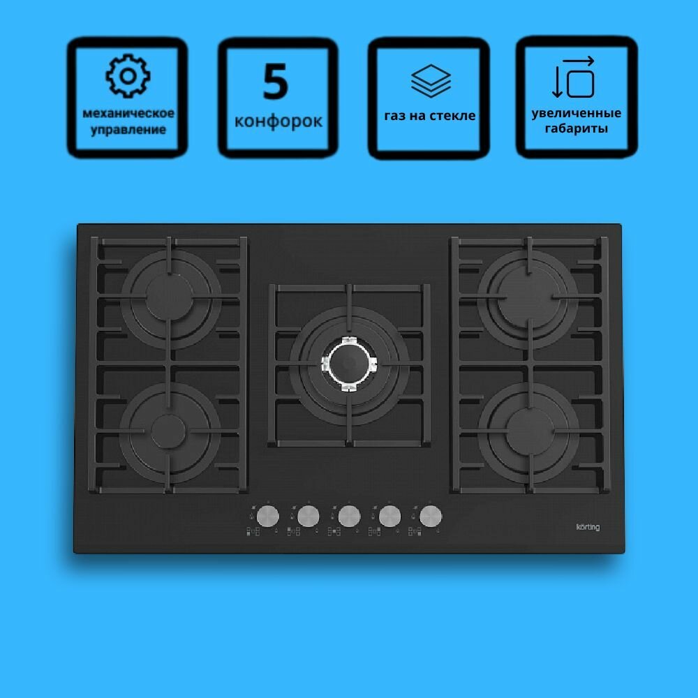 Газовая варочная панель Korting HGG 9835 CTN, черное стекло, 90 см, газ-контроль, электроподжиг, чугунные держатели для посуды, экспресс-конфорка, безопасное управление, подставка WOK+адаптер для кофейника