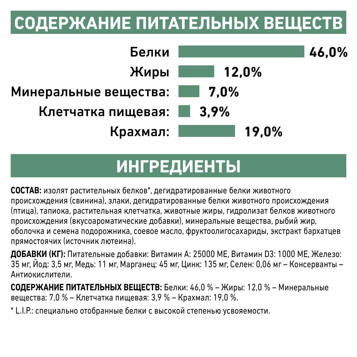 | Состав | дегидратированные белки животного происхождения (птица), ячмень, пшеничная клейковина, кукурузная клейковина, тапиока, изолят белка сои, животные жиры, гидролизат белков животного происхождения, растительная клетчатка, экстракт цикория, рыбий жир, оболочка и семена подорожника, минеральные вещества, фруктоолигосахариды, соевое масло, экстракт бархатцев прямостоячих |