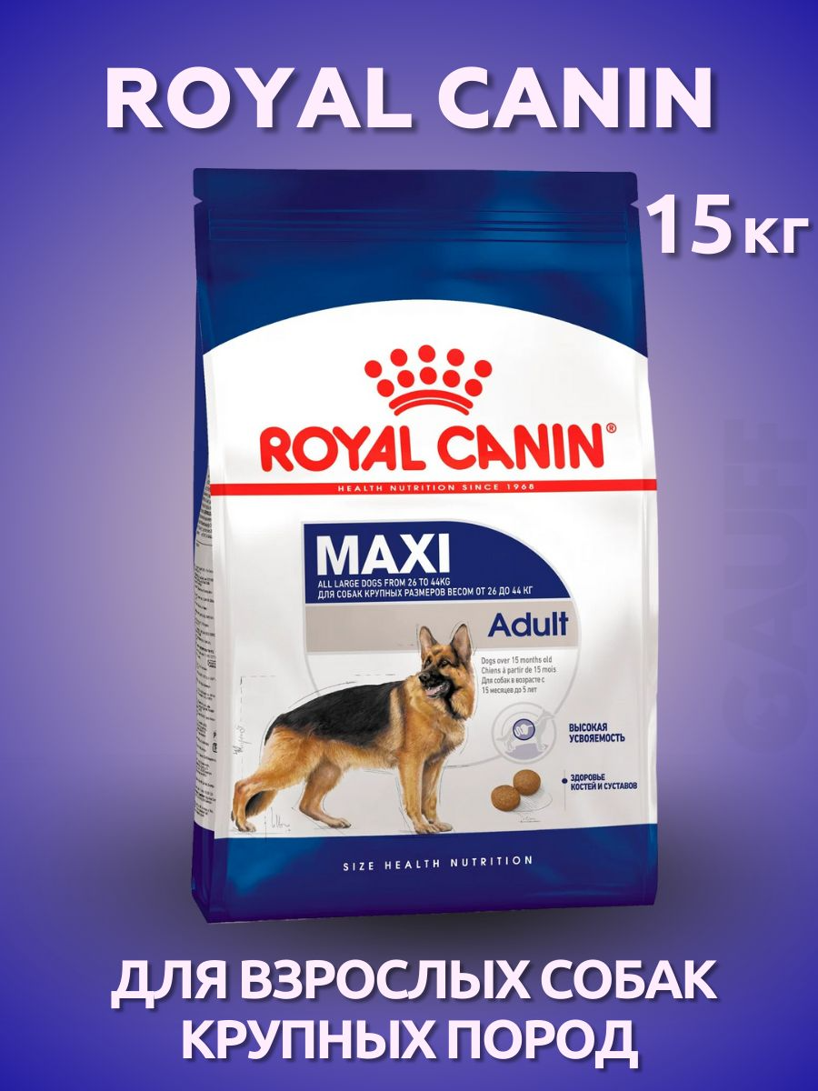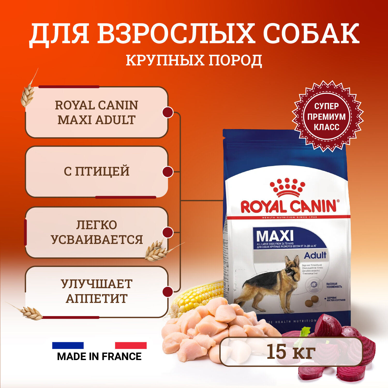 Корм сухой Royal Canin Maxi Adult для взрослых собак крупных пород (от 26 до 44 кг), от 15 месяцев до 5 лет, 15 кг
