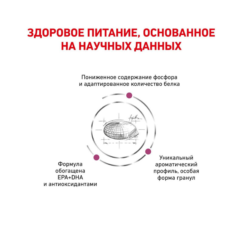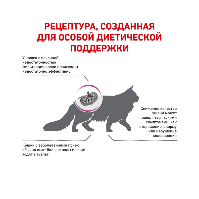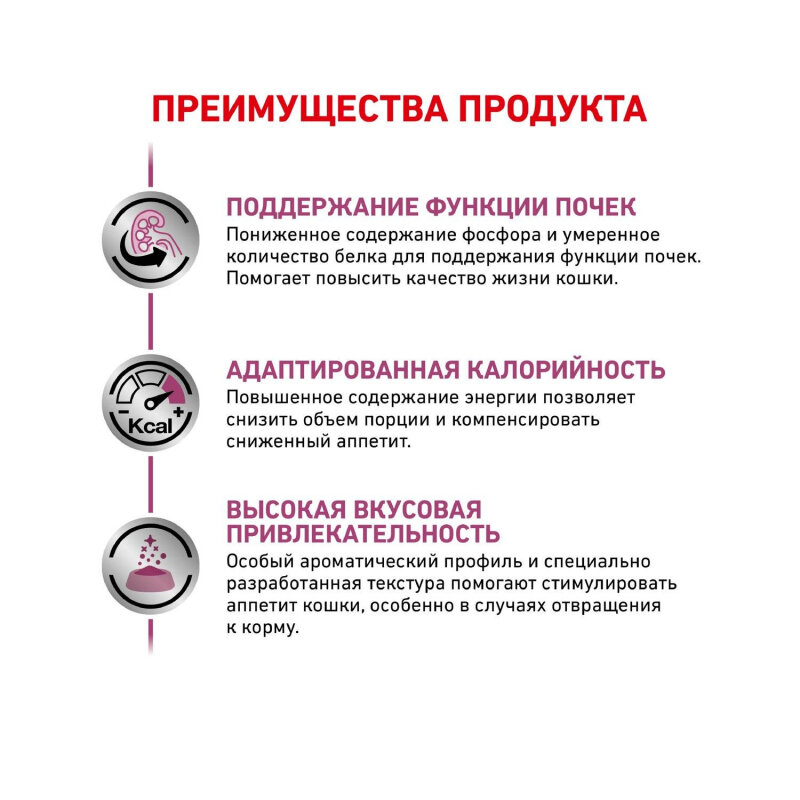 | Дополнительная информация | 1. Поддержание функции почек Пониженное содержание фосфора и умеренное количество высококачественного белка для поддержания функции почек помогают повысить качество жизни животного. 2. Адаптированное содержание энергии Повышенное содержание энергии позволяет снизить объем порции и компенсировать сниженный аппетит. 3. Высокая вкусовая привлекательность Особый ароматический профиль и специально разработанная текстура помогают стимулировать аппетит кошки, особенно в случаях отвращения к корму. |