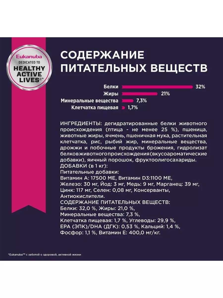 | Состав | дегидратированные белки животного происхождения (домашняя птица) 37%, пшеница, жир животный, ячмень, пшеничная мука, пульпа сахарной свеклы, рис, сухое цельное яйцо, рыбий жир, минералы, гидролизированный животный белок, сухие пивные дрожжи, фрукто-олиго-сахариды |