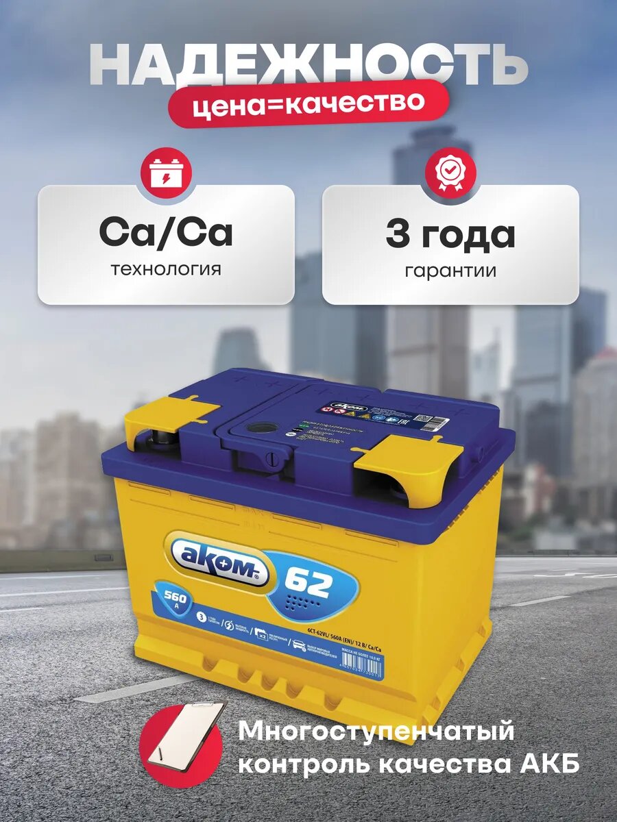 Ниже Вы можете прочитать отзывы на AKOM 6CT-62.0 LA Аккумулятор АКОМ 62 А/ч Обратная R+ 242x175x190 EN560 А, ознакомится с подробными характеристиками, посмотреть интересные обзоры и фотографии на AKOM 6CT-62.0 LA Аккумулятор АКОМ 62 А/ч Обратная R+ 242x175x190 EN560 А.