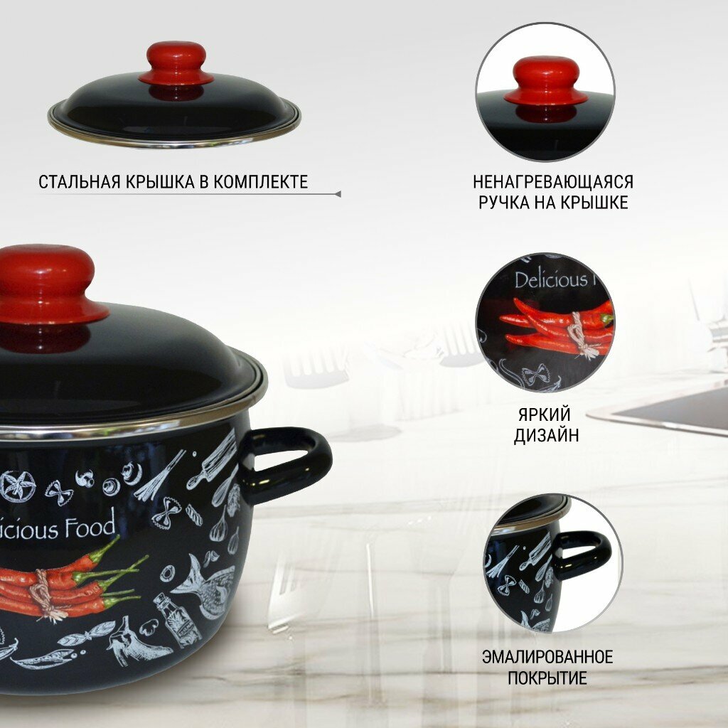 Кастрюля сталь, эмалированное покрытие, 4 л, с крышкой, крышка сталь, Appetite, Chilli, 1МС201Р, черная