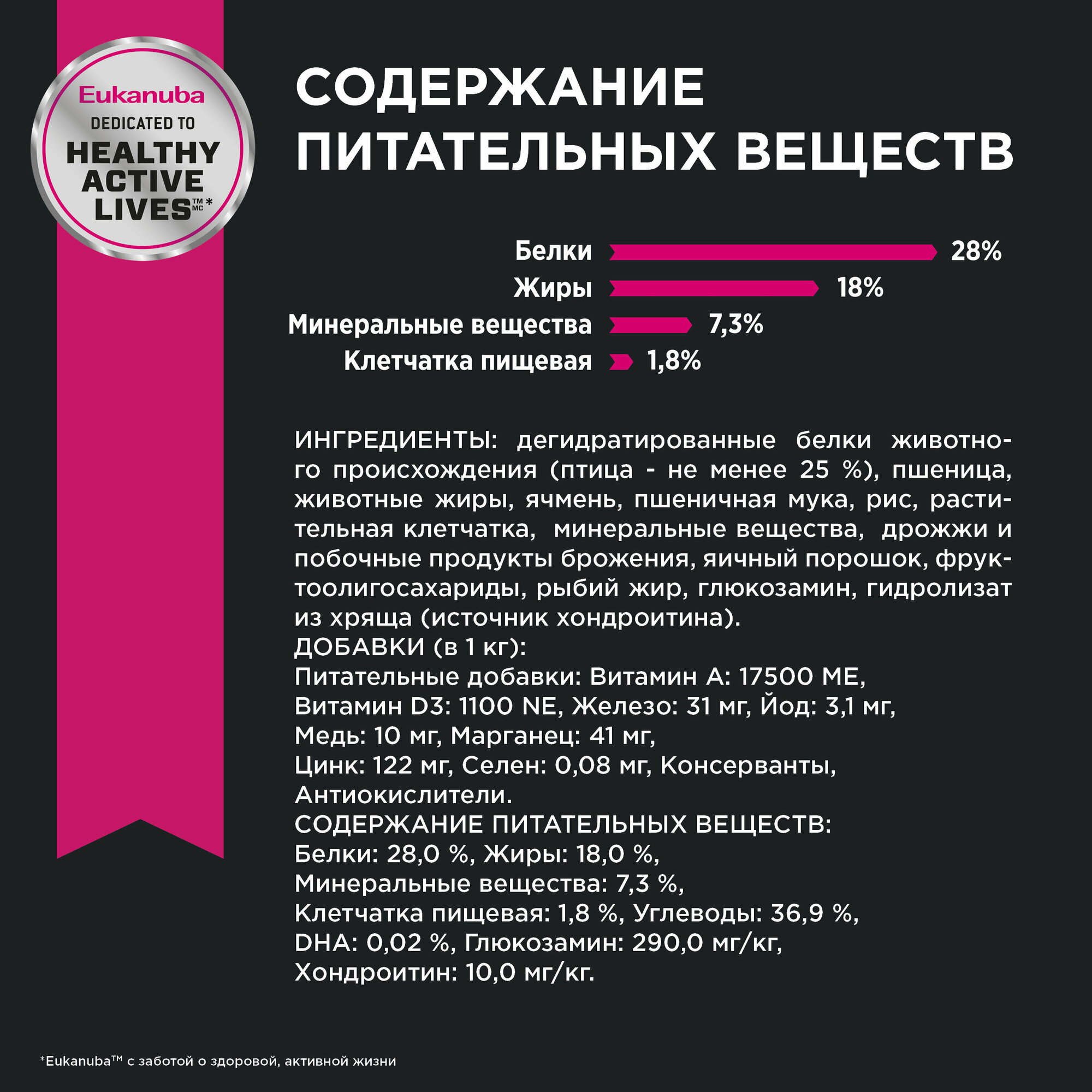 | Состав | обновленный: дегидратированные белки животного происхождения (птица – не менее 25 %), пшеница, животные жиры, ячмень, пшеничная мука, рис, растительная клетчатка, минеральные вещества, дрожжи и побочные продукты брожения, яичный порошок, фруктоолигосахариды, рыбий жир, глюкозамин, гидролизат из хряща (источник хондроитина). прежний: сушеное мясо курицы и индейки, кукуруза, пшеница, животный жир, рис, сорго, ячмень, гидролизованный животный белок, сухая пульпа сахарной свеклы, сухое цельное яйцо, фруктоолигосахариды, рыбий жир, хлорид калия, поваренная соль, гексаметафосфат натрия, льняное семя, карбонат кальция. |
