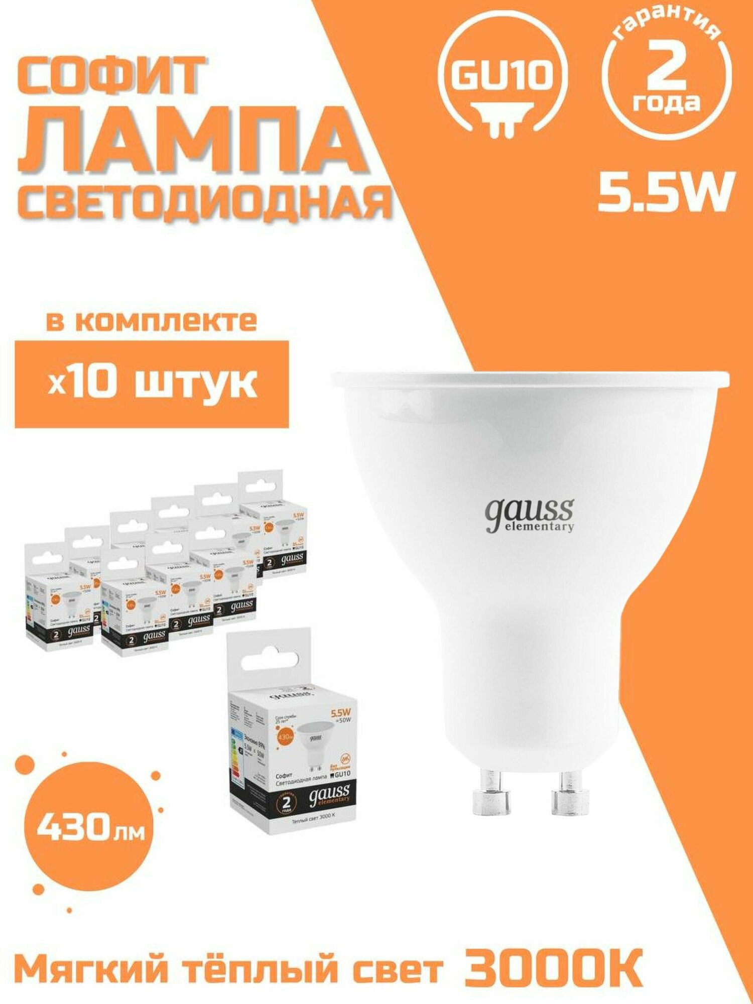 Упаковка светодиодных ламп 10 шт. gauss Elementary 13616, GU10, MR16, 5.5Вт, 3000 К
