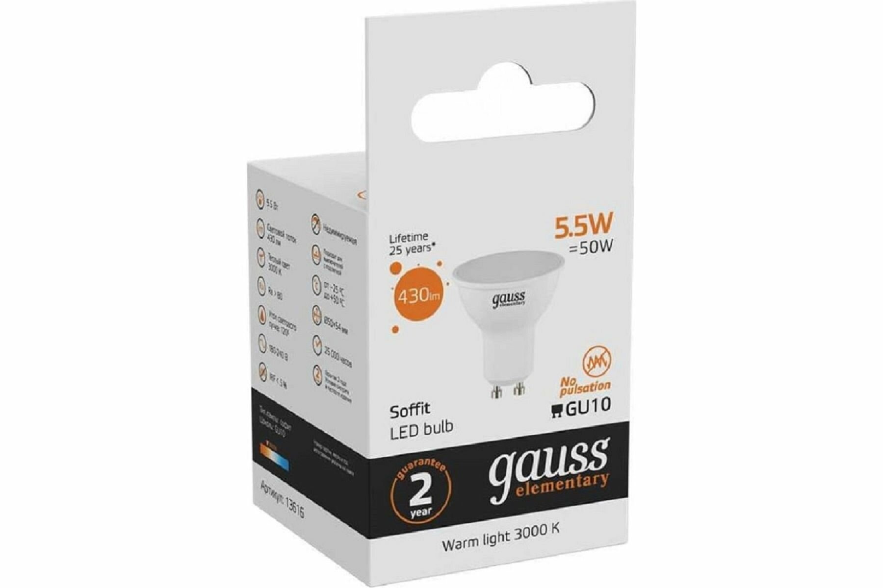 Упаковка по 10 шт. лампа светодиодная Elementary 5.5Вт 2700К тепл. бел. GU10 430лм 220-240В GAUSS 13616
