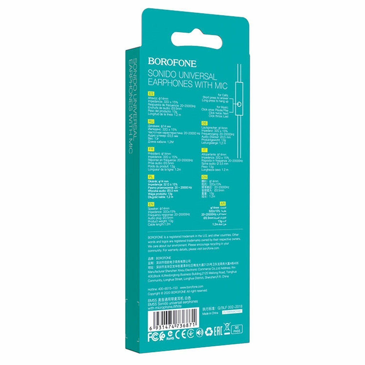 Наушники Borofone BM55 Sonido, вкладыши, микрофон, Jack 3.5 мм, кабель 1.2 м, белые