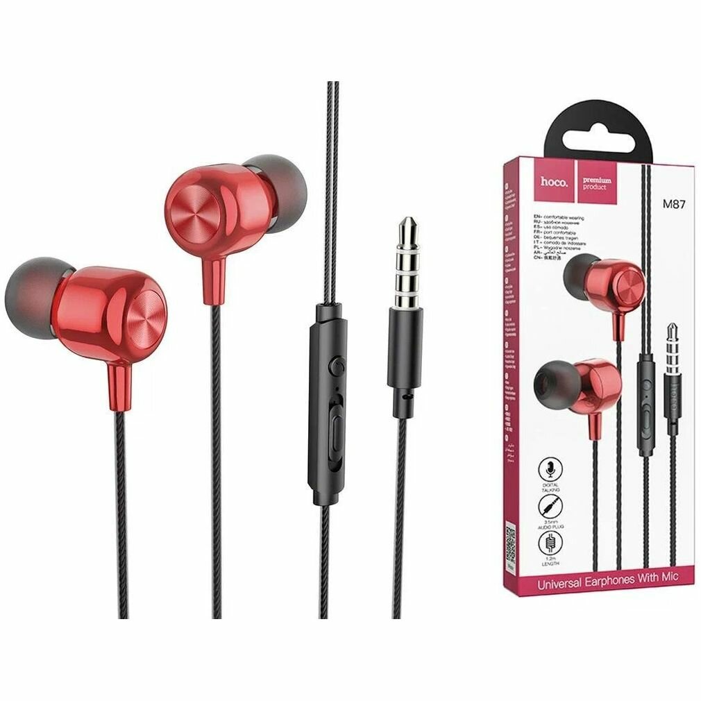 Наушники вакуумные для AUX разъема с микрофоном и регулятором громкости длина 1.2м Hoco M87 Red Flame
