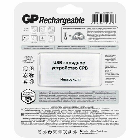 Зарядное устройство GP CPB-2CR4 + 4 аккумулятора AAA 1000 мАч, USB