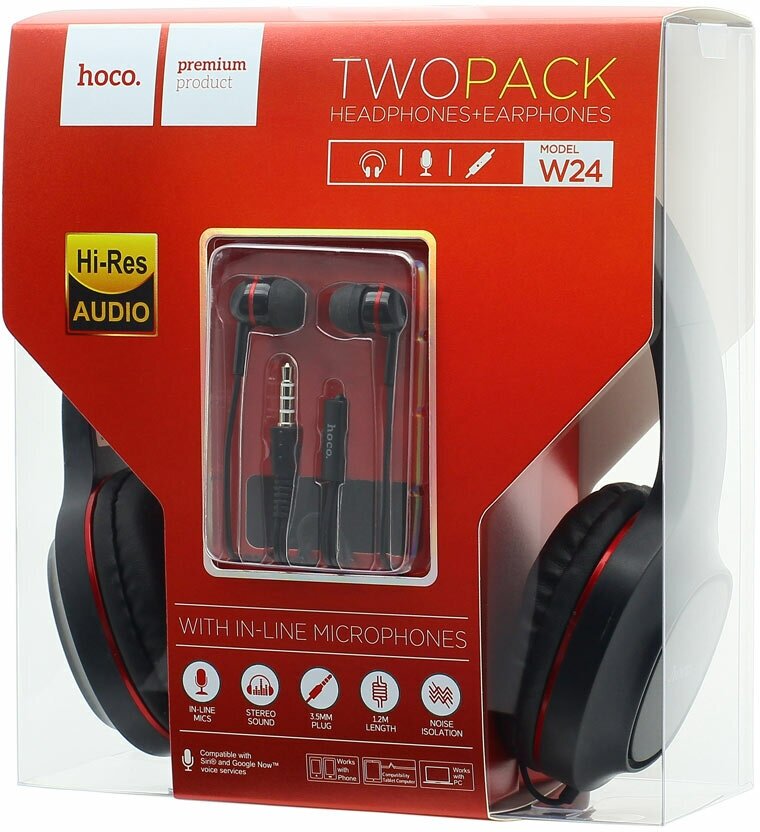 Комплект наушники с микрофоном Hoco W24 полноразмерные и наушники вкладыши, черно-красные
