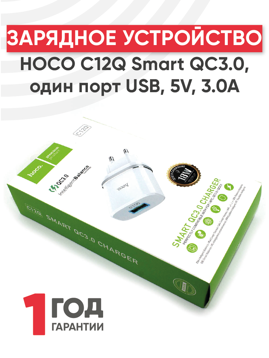Блок питания (сетевой адаптер) HOCO С12Q Smart QC3.0, один порт USB, 5V, 3.0A, белый