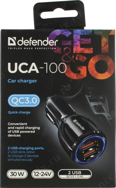 Зарядное устройство Defender Зарядное устройство автомобильное Defender UCA-100 83833, 1xUSB 2.4A, 1xUSB QC3.0, (5400 мА) черный (ret)