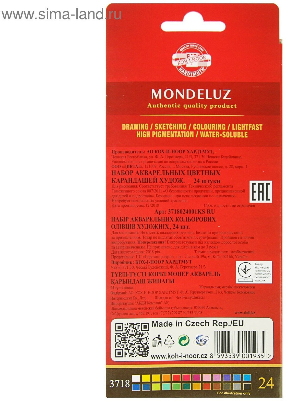 Карандаши цветные акварельные художественные KOH-I-NOOR "Mondeluz", 24 цвета, 3,8 мм, заточенные, европодвес, 3718024001KSRU, 181032