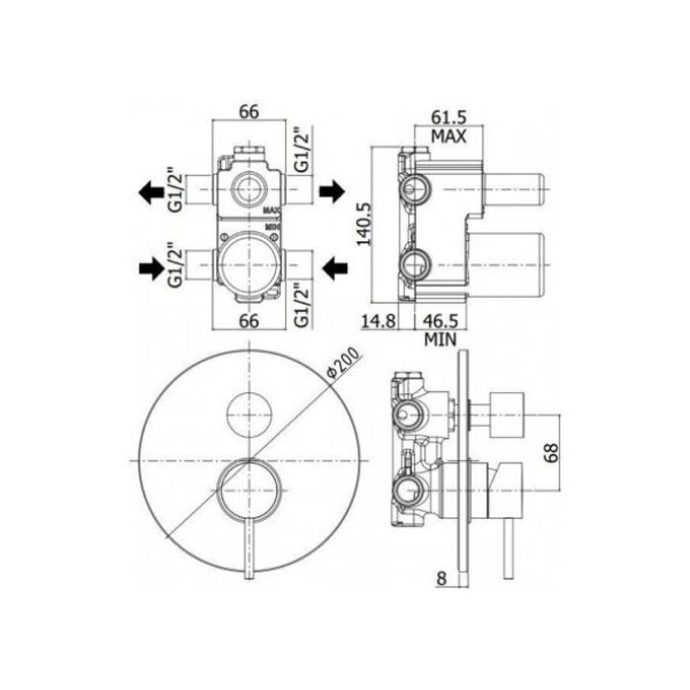 Смеситель Paffoni, серии LIGHT, встраиваемый для душа на 3 выход с накладкой из металла диам.200мм, девиатор-картридж, 3 положения+3 комбо,Белый матовый LIG019BO