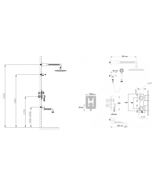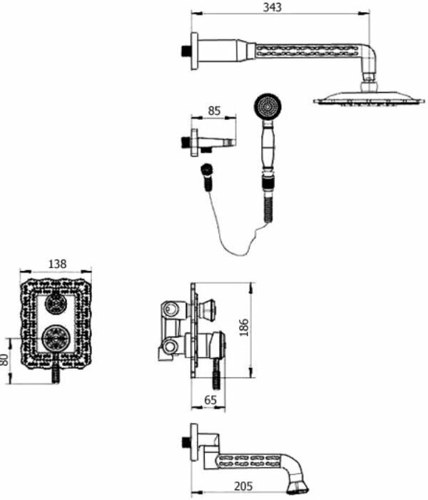 | Комплектация | корпус смесителя - 1 шт. / декоративная накладка - 1 шт. / металлическая рукоятка - 1 шт. / рукоятка переключателя-дивертора - 1 шт. / настенный держатель для лейки верхнего душа - 1 шт. / душевая лейка - 1 шт. / верхний душ - 1 шт. / излив - 1 шт. / душевой шланг - 1 шт. / настенный держатель для душевой лейки - 1 шт. |